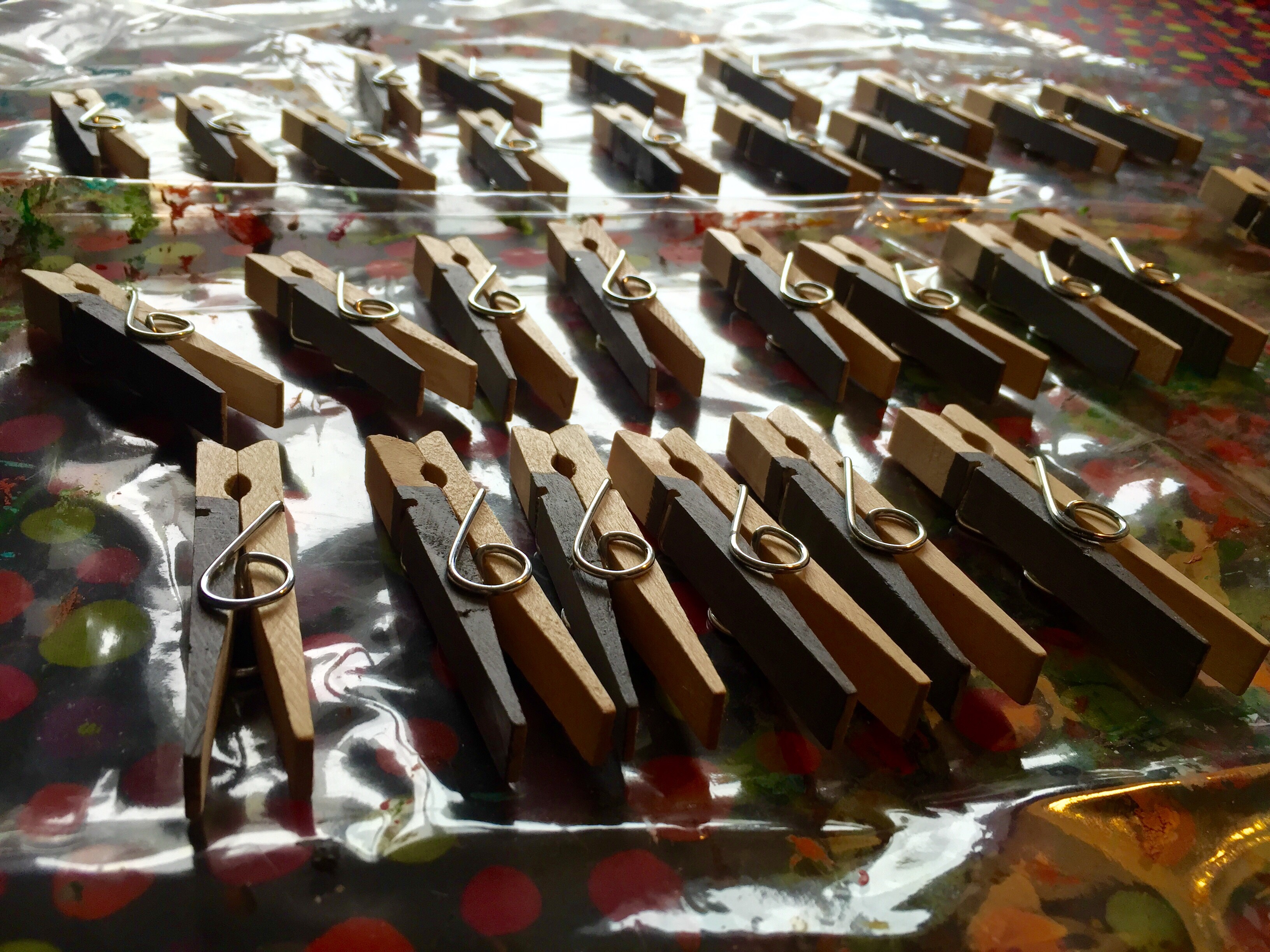 Materialer: tøjklemmer, akrylmaling, en god tynd pensel, pap, limpistol, pailletter, tyl, glimmertape