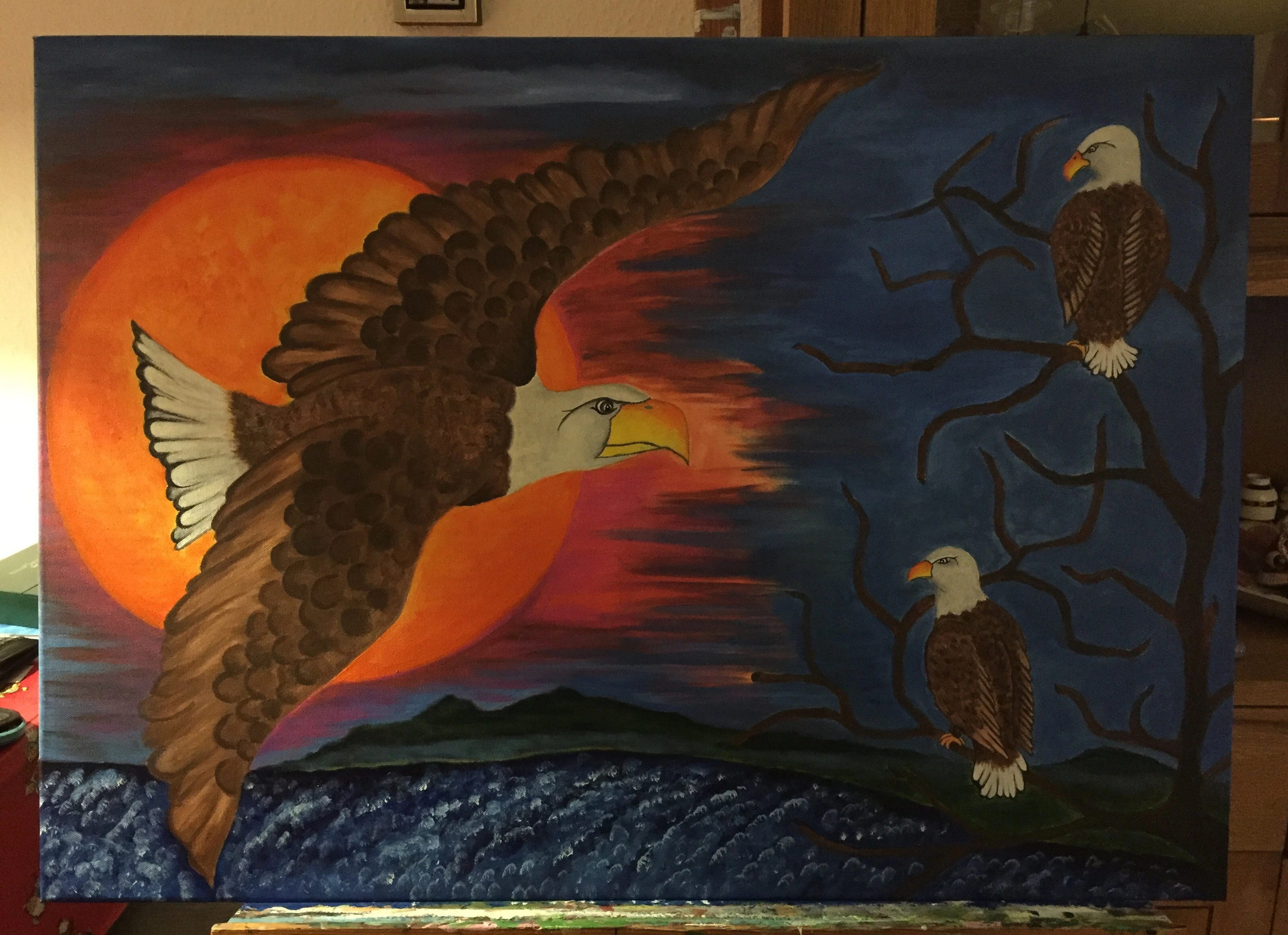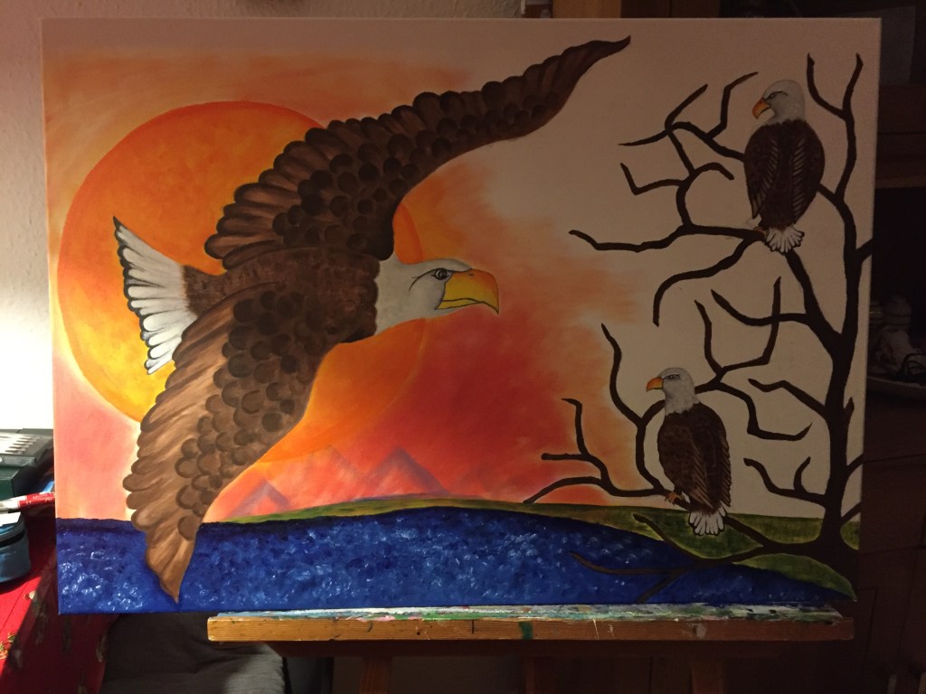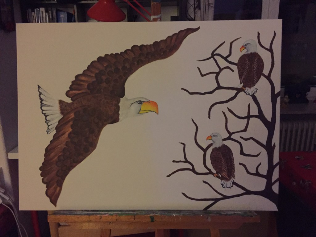 Som i kan se blev 2 ørne til 3, en beslutning jeg selv tog, for at skabe ligevægt i maleriet, og som heldigvis også faldt i god jord hos modtageren. Det skal siges, at havde modtager ikke være tilfreds, havde jeg selvfølgelig ændret det, eller nok startet forfra, men engang imellem må man som “kunster” tage nogle beslutninger, og så må det briste eller bære som man siger 🙂