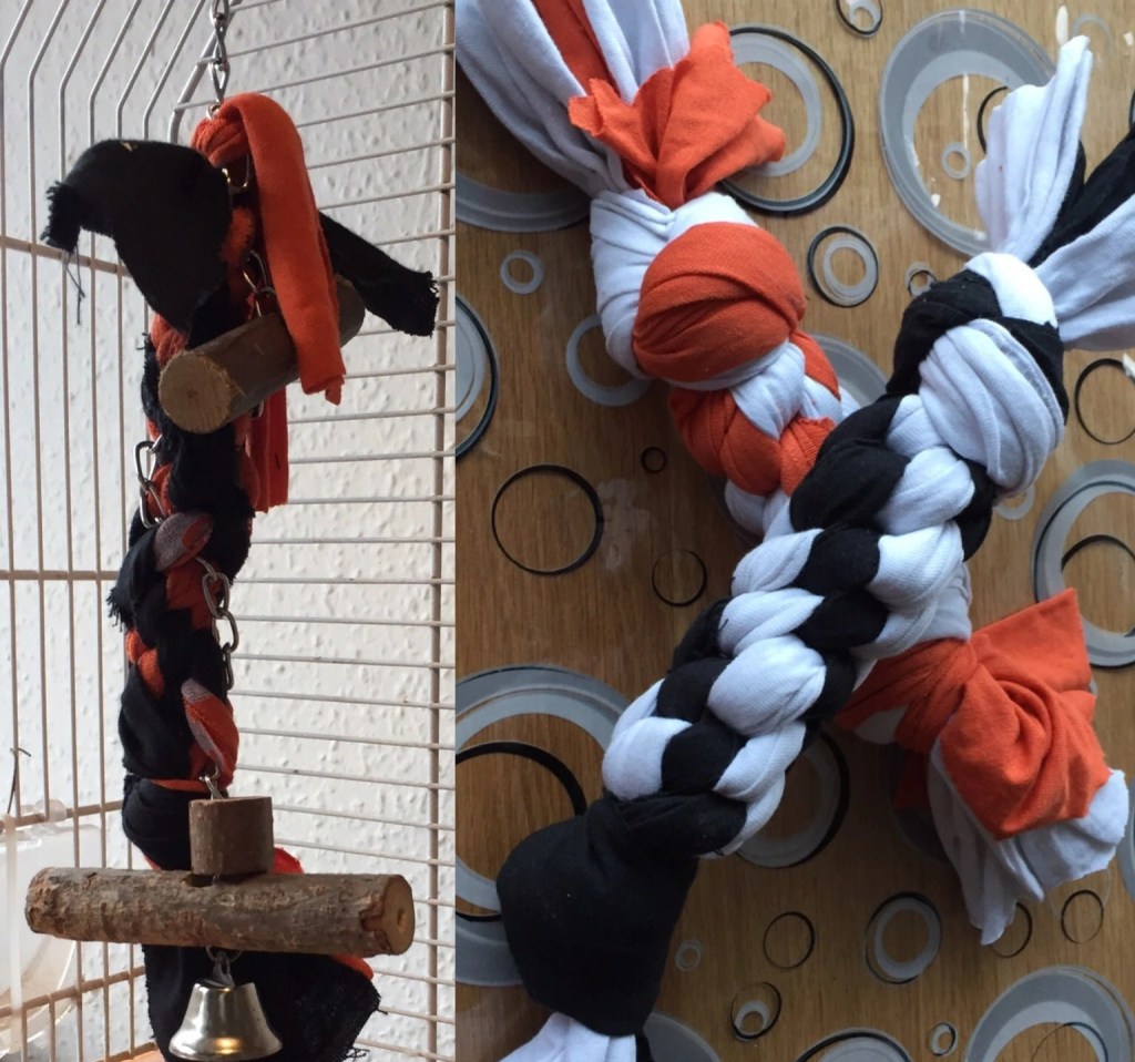 Hundelegetøjet/Fuglelegetøjet er lavet ude af et par gamle t-shirts og et gammelt lagen (men alt stof kan bruges) Til fuglelegetøjet er der brugt yderligere en kæde (trukket igennem rebet) og 3 pinde genbrug fra et andet stykke fuglelegetøj.