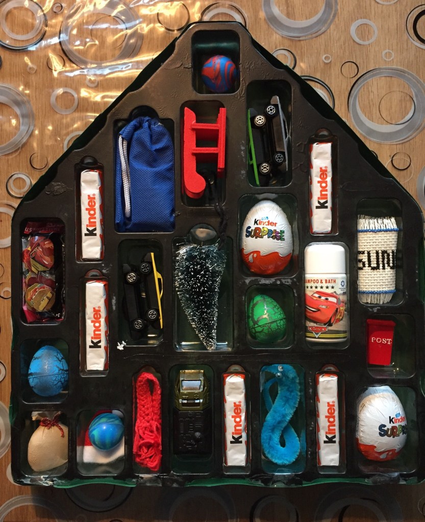 I min hjemmelavede julekalender er bl.a. 2 hoppebolde, lidt snoller (kinderæg, og kinderstænger, de passede bedst i hullerne), en pakke med klistermærker, et par biler, et hjemmelavede bogmærke, en “magisk” orm, 2 æg (med dinosaurer, der kan udklækkes i vand, CARS shampoo, matematikterninger, og ting til nissen (Forklaring følger!)