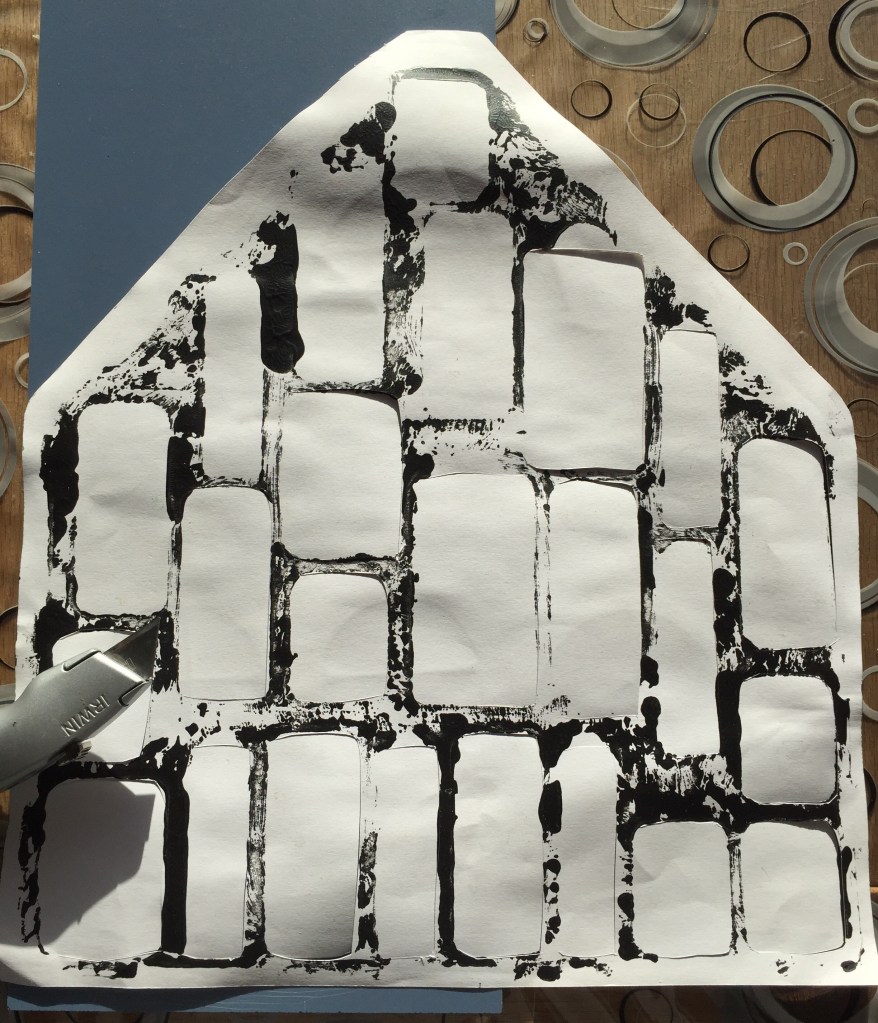 Når julekalenderen er fyldt, skal man have lavet forsiden, og have lavet de 24 låger i julekalenderen, og her er det selvfølgelig vigtigt at lågerne passer med hullerne. Derfor malede jeg hele julekalenderen sort, og på den måde kunne jeg lave et aftryk af hullerne, jeg kunne skære låger efter. Lågerne er efterfølgende lukket med en lille smule tape.