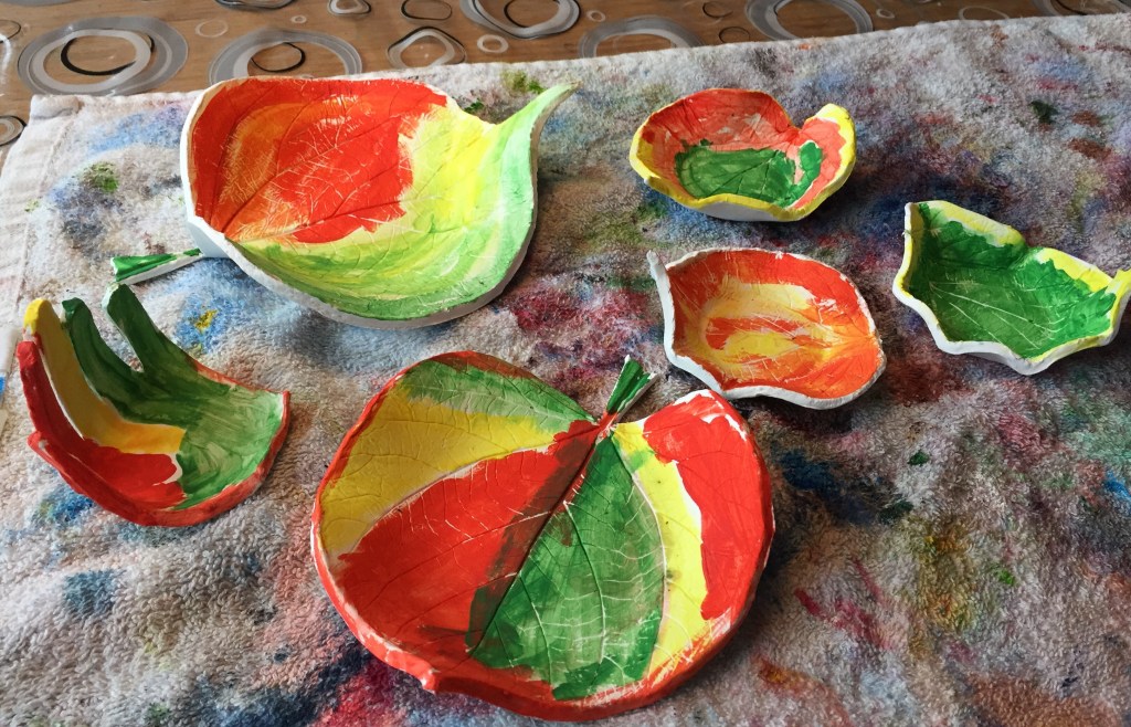 Men for at gøre en historie kort, kom min søn til mig engang hen i efteråret og ville gerne lave julegaver til sine bedsteforældre og oldeforældre. Derfor gik vi en lang tur i skoven, hvor vi hyggede og samlede blade. Da vi kom hjem, hjalp vi hinanden med at lave bladskåle i selvhærdende ler. Det var super nemt og blev til nogle rigtig flotte kreative gaver .