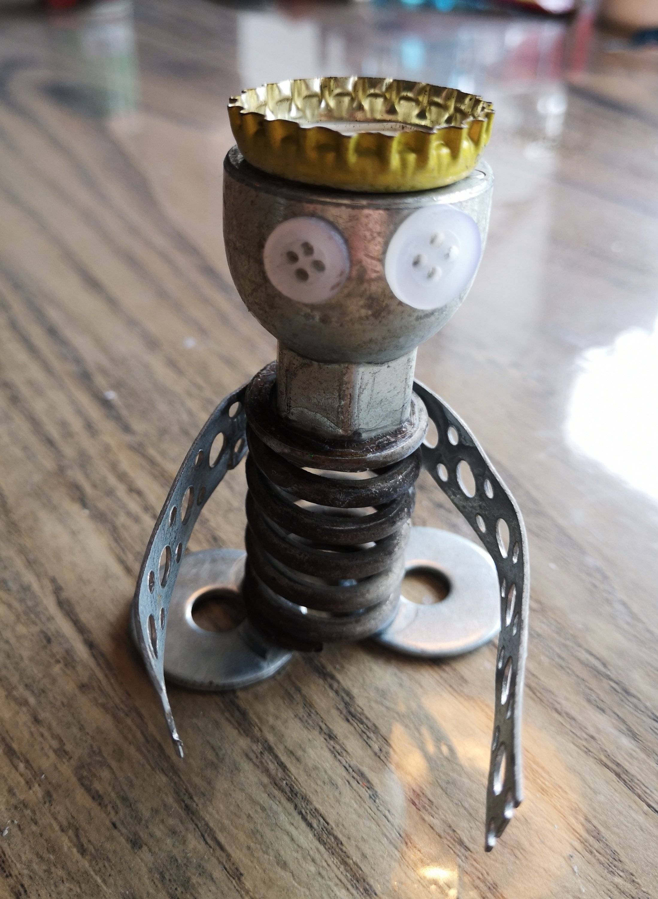 Når du har fået samlet en god portion metal (og andet skrot og skrammel), er du klar til at gå i gang med dit metal kunstværk! Det kan være du allerede har fået en masse idéer til dit gør-det-selv metal kunst, men er du helt på bar bund vil jeg anbefale at du tager et øjeblik til at kigge rundt på de ting du har samlet. Kapsler, møtrikker og knapper er fx oplagte til øjne, bøtter og dåser er oplagte til krop, mens gamle nøgler og cola dimser er oplagte til næse. Tag tingene i hånden, kombiner dem, sæt dem sammen, og udforsk. En ugle, en hund eller en robot, der er mange muligheder! Prøv gerne en masse forskelligt inden du til sidst limer det sammen.