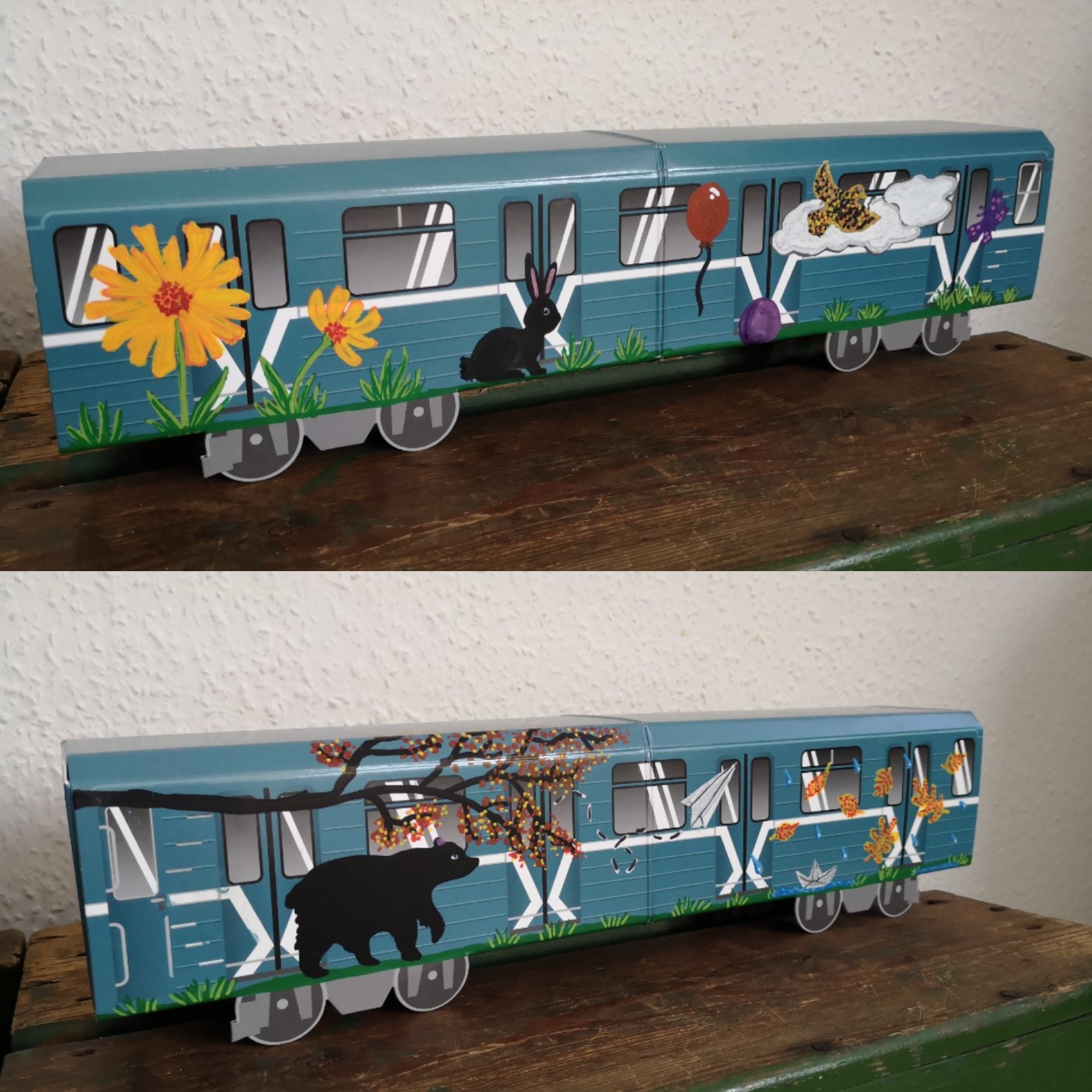 Molotow mini subwayz er altså navnet på de hyggelige toge. De er lavet i stærk pap og ankommer med folde vejledninger, så du og børnene uden problemer kan tegne og udfolde jeres kreative evner på de skønne mini subwayz.