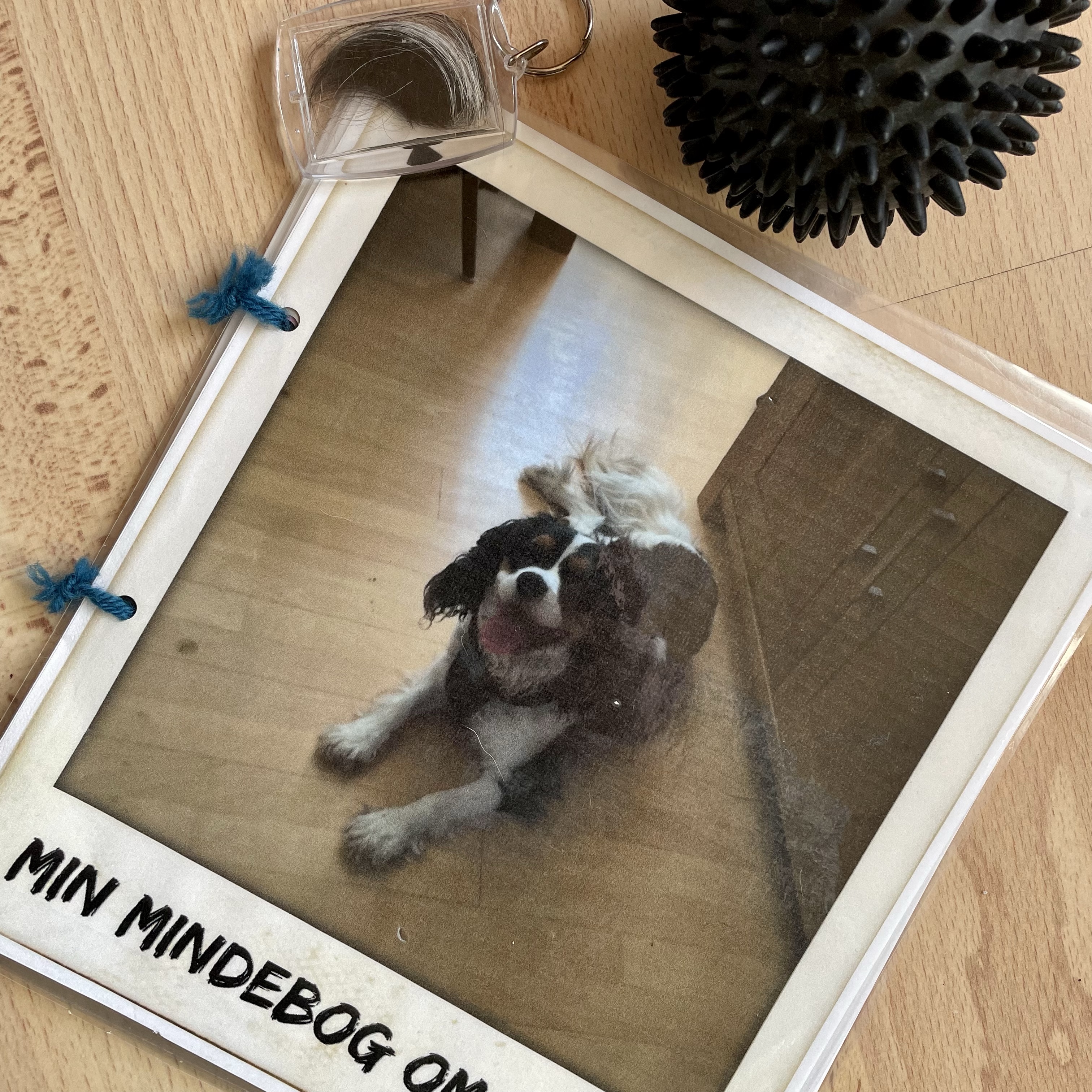 Billederne i bogen har jeg sat sammen som collager. Det kan nemt gøres via en app eller en hjemmeside ala canva.com Herefter blev alle billederne printet og lamineret, sammen med den sidste tot hår. Herefter laves huller og siderne sættes sammen med et lille stykke snor. Udover bogen og nøgleringen har min søn beholdt Luntes ynglingsbold og halsbåndet.