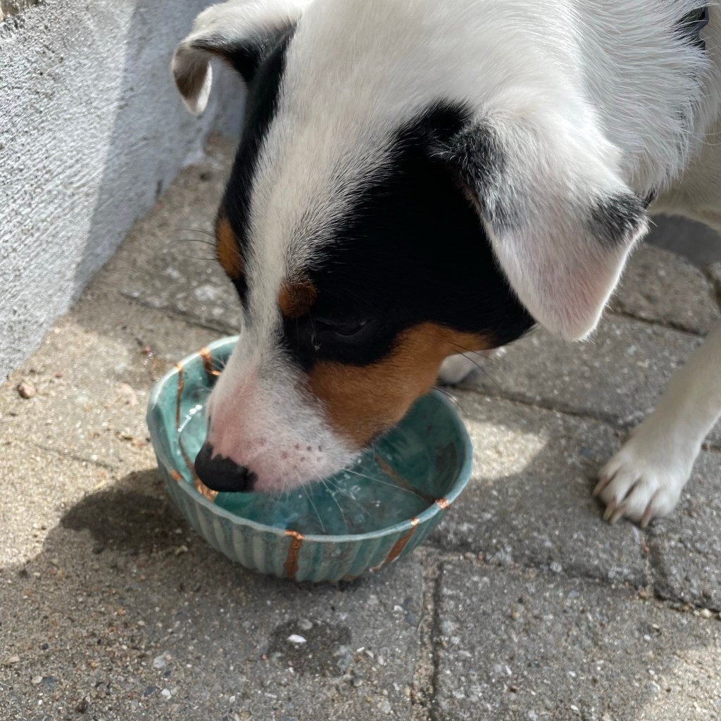 Resultatet blev super flot! Smuk, og helt uperfekt perfekt! – og hunden kan igen få vand fra den smukke skål her i sommervarmen!