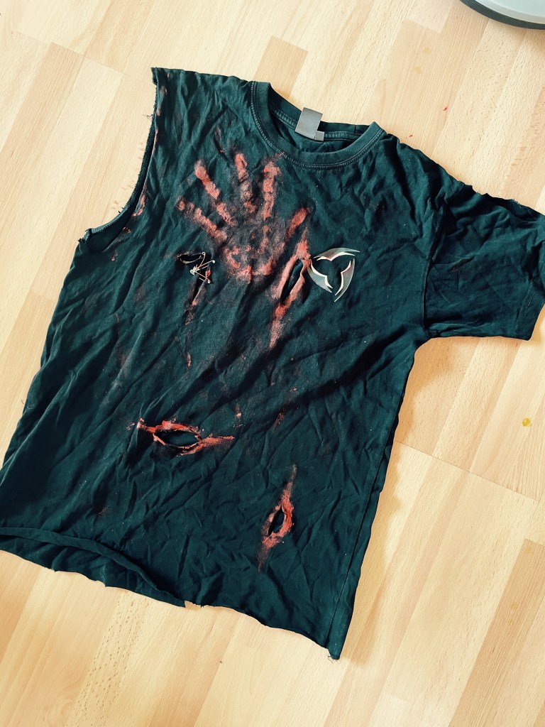 Du skal bruge: rød og sort maling (rød til blod, og den sorte bruges til at lave en lidt mørkere rød, der får blodet til at lidt mere realistisk ud) og noget gammelt tøj evt sikkerhedsnåle.