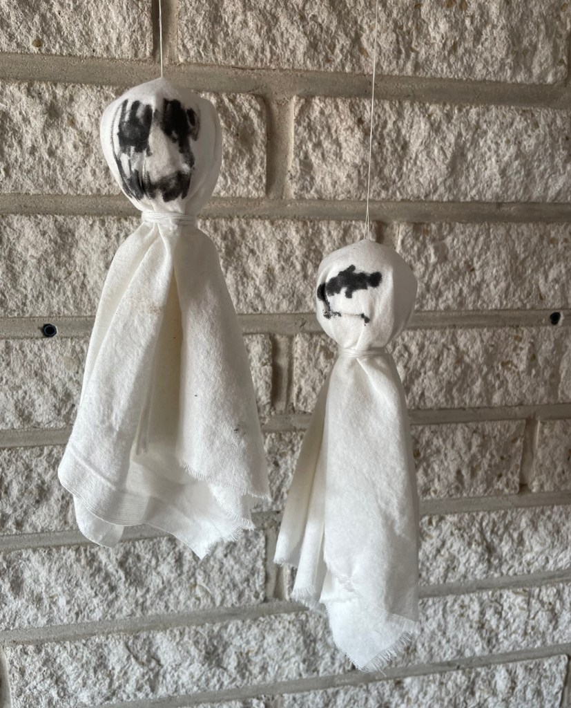 Først og fremmest skal der Halloween pyntes lidt – og hvorfor ikke genbruge ting fra hverdagen der alligevel skal smides ud eller på lossepladsen.