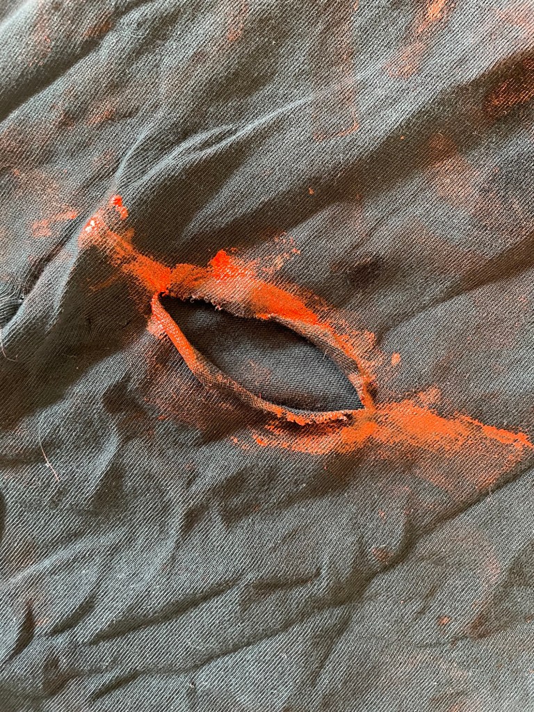 - Brug den røde maling til blodige pletter på tøjet og gerne hvor du har lavet huller
