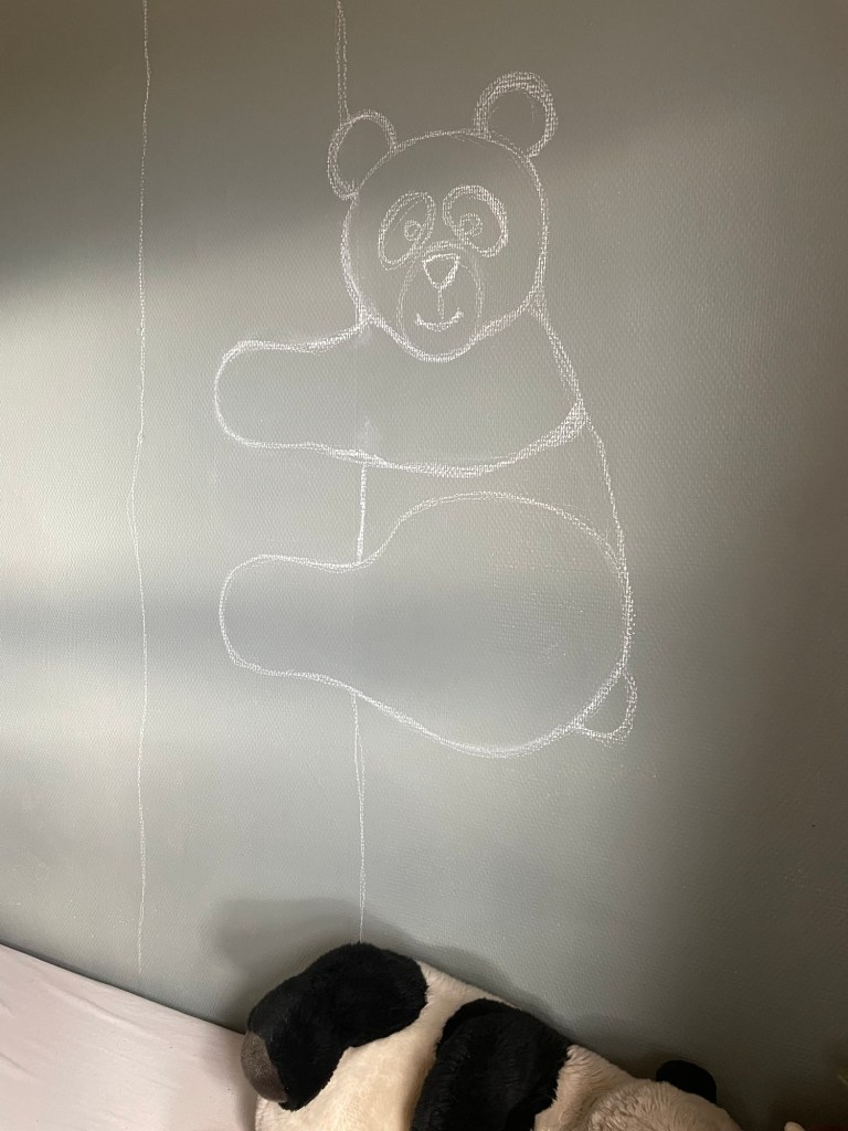 - Tegn motivet op på væggen, inden du maler, på den måde får du færre fejl. Jeg har brugt vandopløselig farvekridt, så farven nemt opløses når der males ovenpå. Det er også nemt at fjerne hvis man kommer til at tegne fejl.