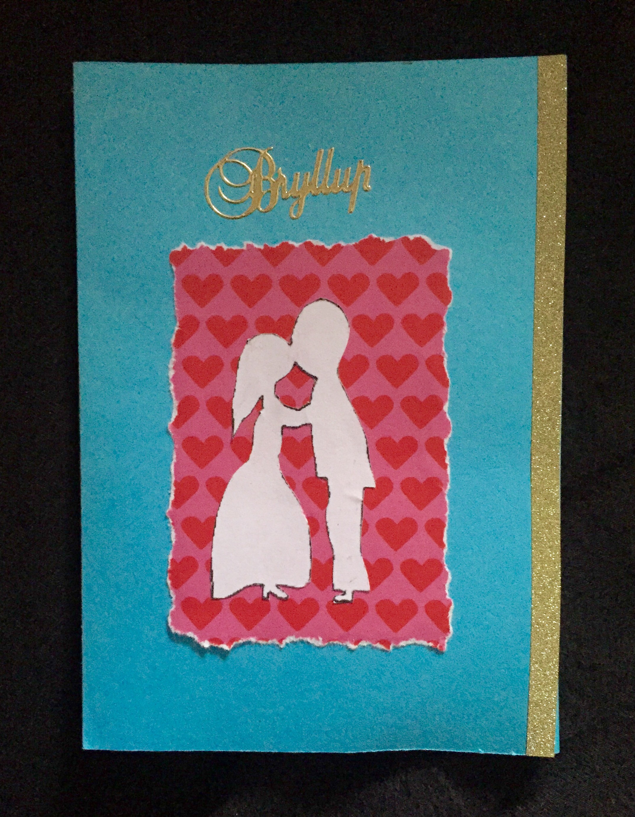 Jeg tegnede motivet af brud og brudgom på et lille papir og scannede ind på computeren, hvorefter jeg redigerede størrelsen, så de blev den størrelse jeg syntes var passende. Derefter skar jeg motivet ud med skalpel. Hjertepapiret er købt i Tiger og målt op og derefter revet i kanterne. Lys Blå karton købt i panduro Hobby, blev skåret til så de passede med en dobbel 10*15 cm. Dette kan også købes så man kun selv skal folde, men det er lige lidt dyrere end hvis man køber et stort karton og selv skærer. Glimmerbånd til kant fandt jeg i netto til 10 kr. Og bryllupsklistermærker også købt i panduro Hobby til 10 kr.